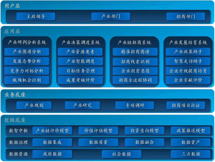 針對目前地方存在的產業(yè)分析缺乏全面性、產業(yè)招商缺乏精準性,通過構建全方位大數(shù)據(jù)底座和全環(huán)節(jié)數(shù)字化賦能,實現(xiàn)對地方產業(yè)工作從產業(yè)分析、到產業(yè)調度、產業(yè)招商、產業(yè)培育的全閉環(huán)支撐。