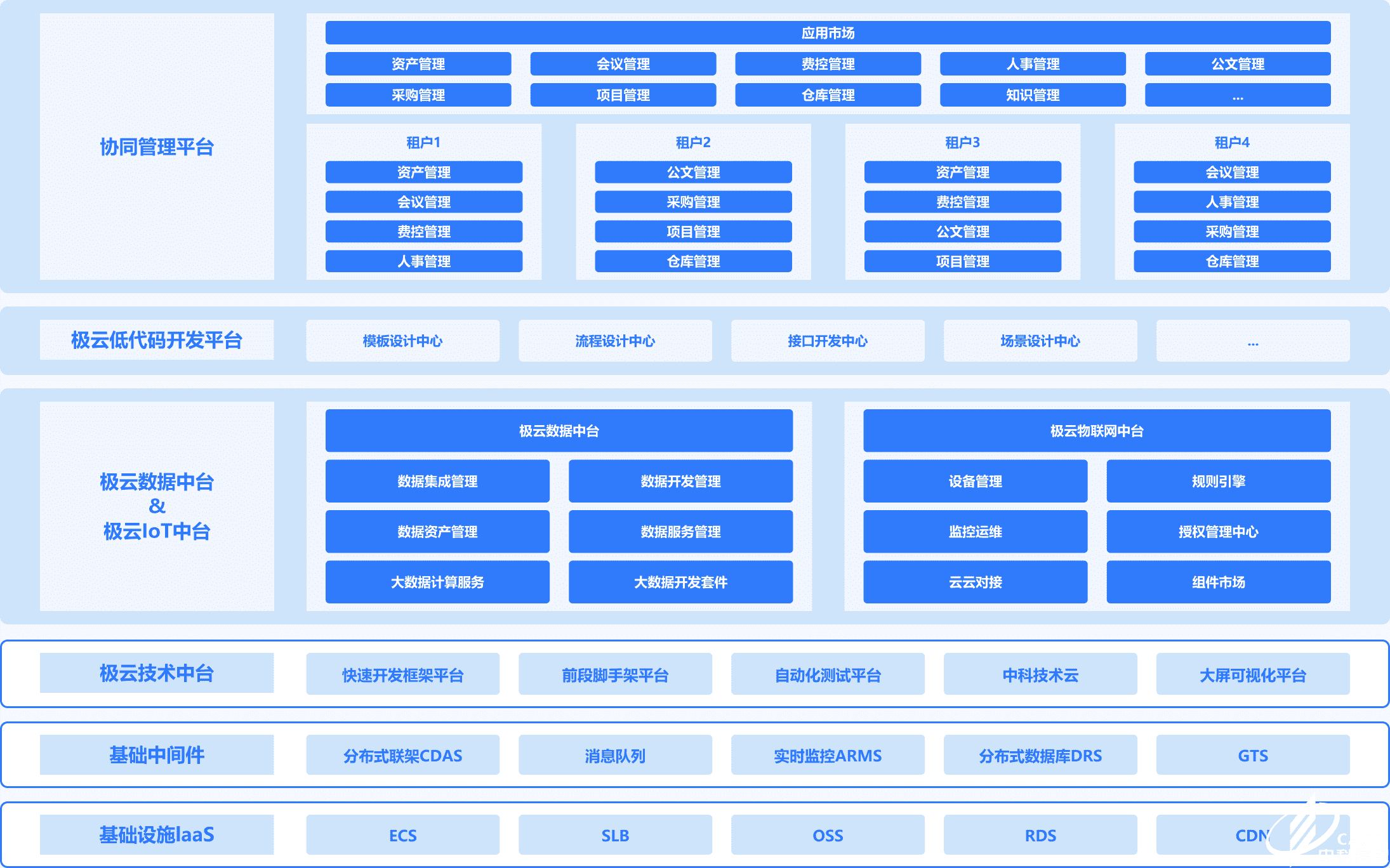 中科極云平臺是一款具有完全自主知識產(chǎn)權(quán)的企業(yè)級通用服務(wù)開發(fā)平臺,包括:極云協(xié)同管理平臺、極云低代碼開發(fā)平臺、極云數(shù)據(jù)中臺、極云物聯(lián)網(wǎng)中臺和極云技術(shù)中臺,是由中科院成都信息技術(shù)股份有限公司基于多年面向行業(yè)化的軟件工程、軟件平臺、軟件開發(fā)技術(shù)的研究應(yīng)用沉淀整合而來。平臺采用微服務(wù)、云計算、大數(shù)據(jù)、流程引擎、統(tǒng)一認(rèn)證等先進(jìn)技術(shù),提供常用的軟件開發(fā)框架及組件庫,將軟件信息化需求抽象成標(biāo)準(zhǔn)的流程、數(shù)據(jù)模型,采用低代碼可視化配置開發(fā)的方式,提供了支持跨平臺的通用軟件開發(fā)能力。
