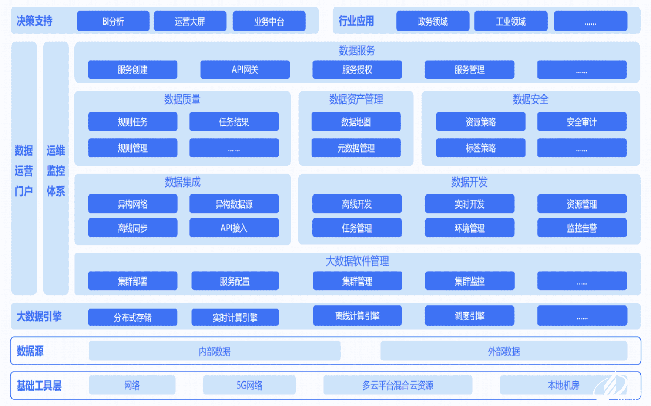 極云數(shù)據(jù)中臺將大數(shù)據(jù)應(yīng)用開發(fā)作為基礎(chǔ)設(shè)施,將海量數(shù)據(jù)進(jìn)行采集、 計算、存儲、加工,同時建立統(tǒng)一標(biāo)準(zhǔn)和口徑。通過數(shù)據(jù)治理形成數(shù)據(jù)資產(chǎn),進(jìn)而向 上支撐應(yīng)用,提供高效的服務(wù)。同時減少數(shù)據(jù)重復(fù)建設(shè)、又降低煙囪式協(xié)作的成本, 為企業(yè)的業(yè)務(wù)創(chuàng)新持續(xù)賦能